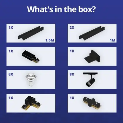 | Manufacturer Name | Complete L shaped 1-Phase Track Set Black incl. 8x Spot fixture + GU10 2700K 3W Dim – 1,5 x 2 meter | |
