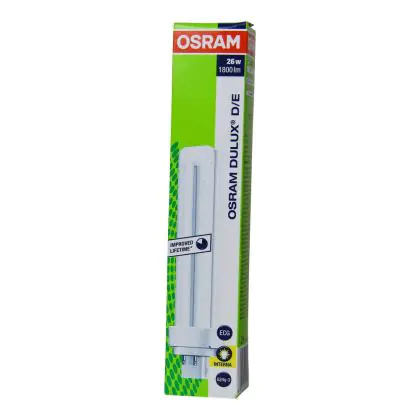 The Osram Dulux D can be used in combination with a conventional ballast. The lamp has a short and compact lamp base type G24q-3. This means that each of these compact fluorescent lamps has a base with 4 pins. The lamps Osram Dulux D/E 26W 827 has a size of 165 mm.